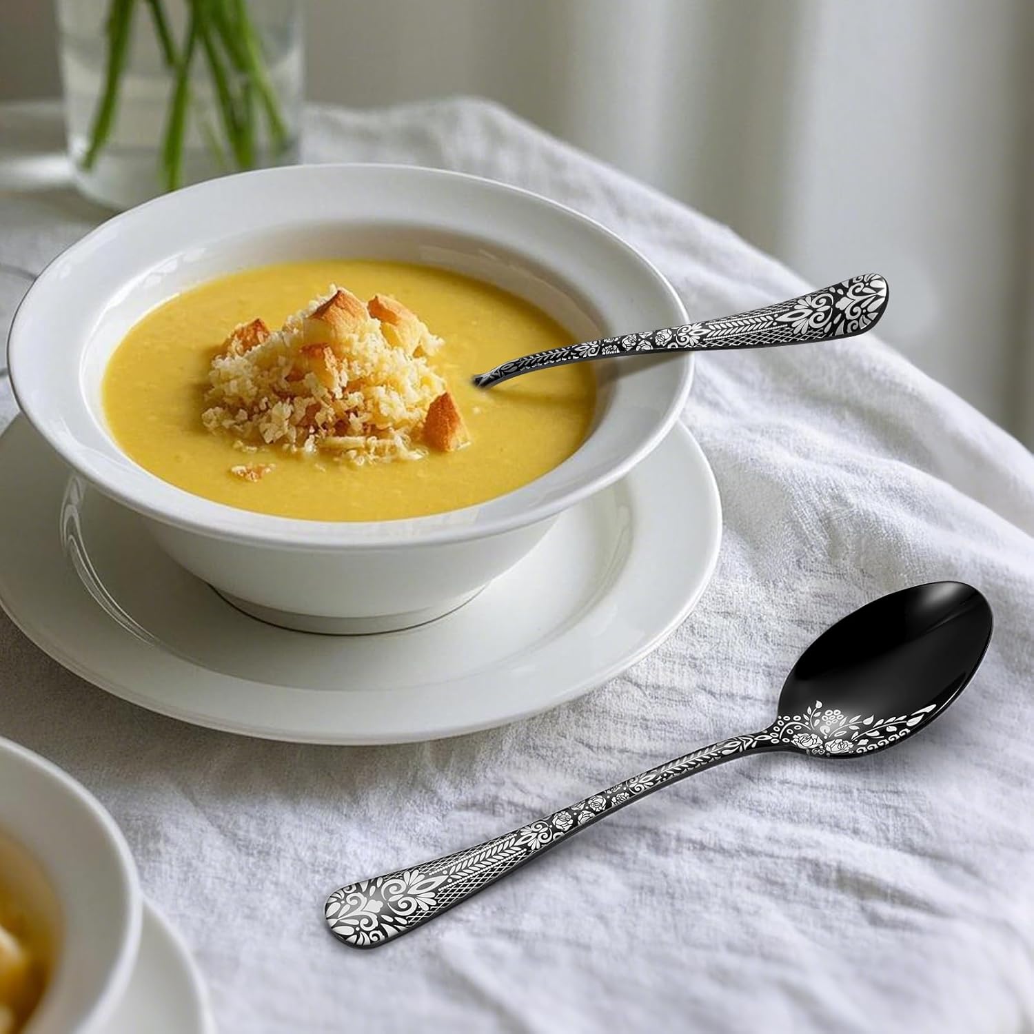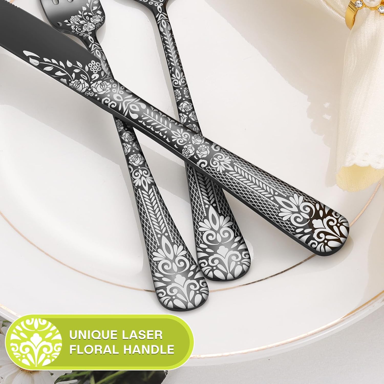 - Unique Craftsmanship: The silverware adopts unique laser technology and fine processing. The surface of the flaware is decorated with floral patterns, and the elegant appearance makes it look noble and elegant. The edges are smooth and the handles have perfect lines, which are comfortable to use and have an excellent grip.