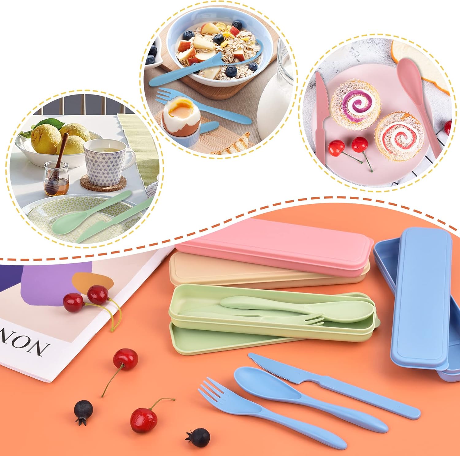 - 【Package】Travel utensils with case for 4 (pink, blue, beige, green) with fork, spoon, knife and storage box, easy to transport and store to meet your daily use life needs.