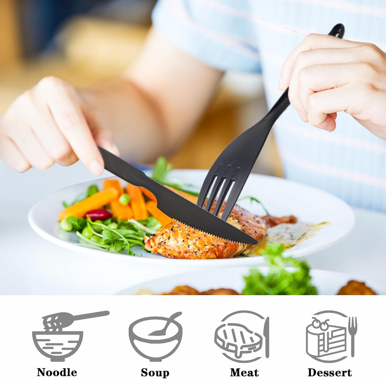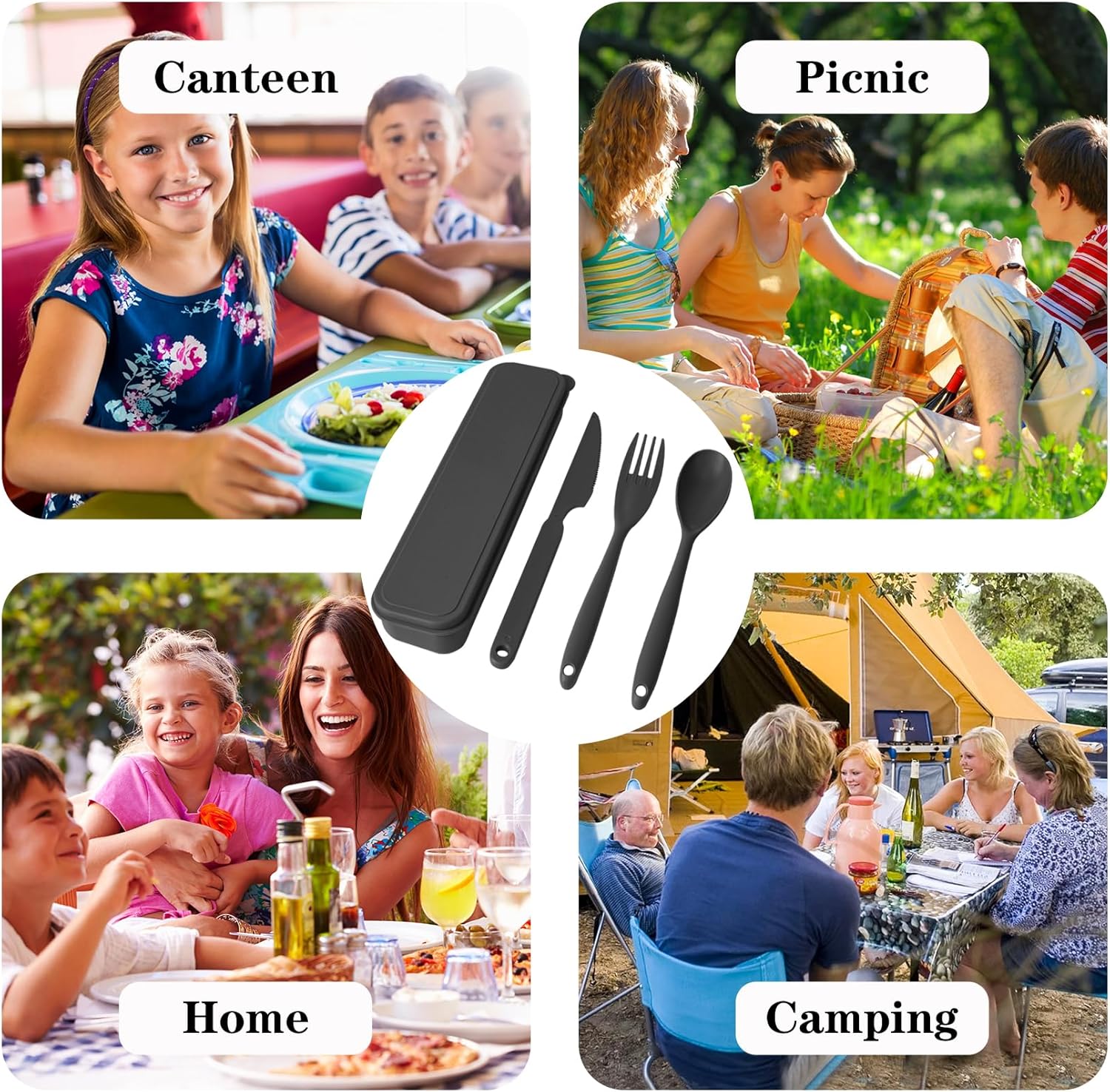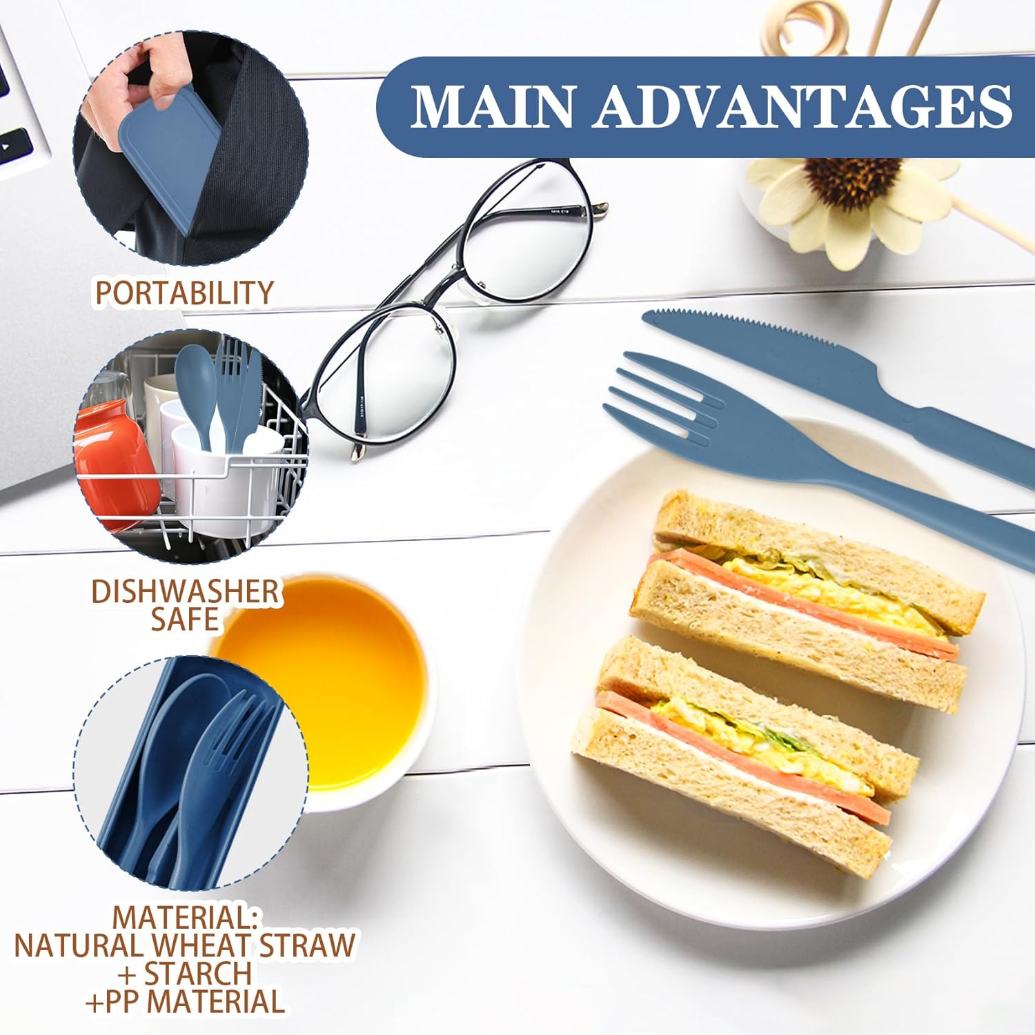 - 【Material and Portability】Our travel utensils are made of high quality plastic and reusable. Traditional stainless steel cutlery is too heavy and difficult to carry. Our flatware set is very lightweight.