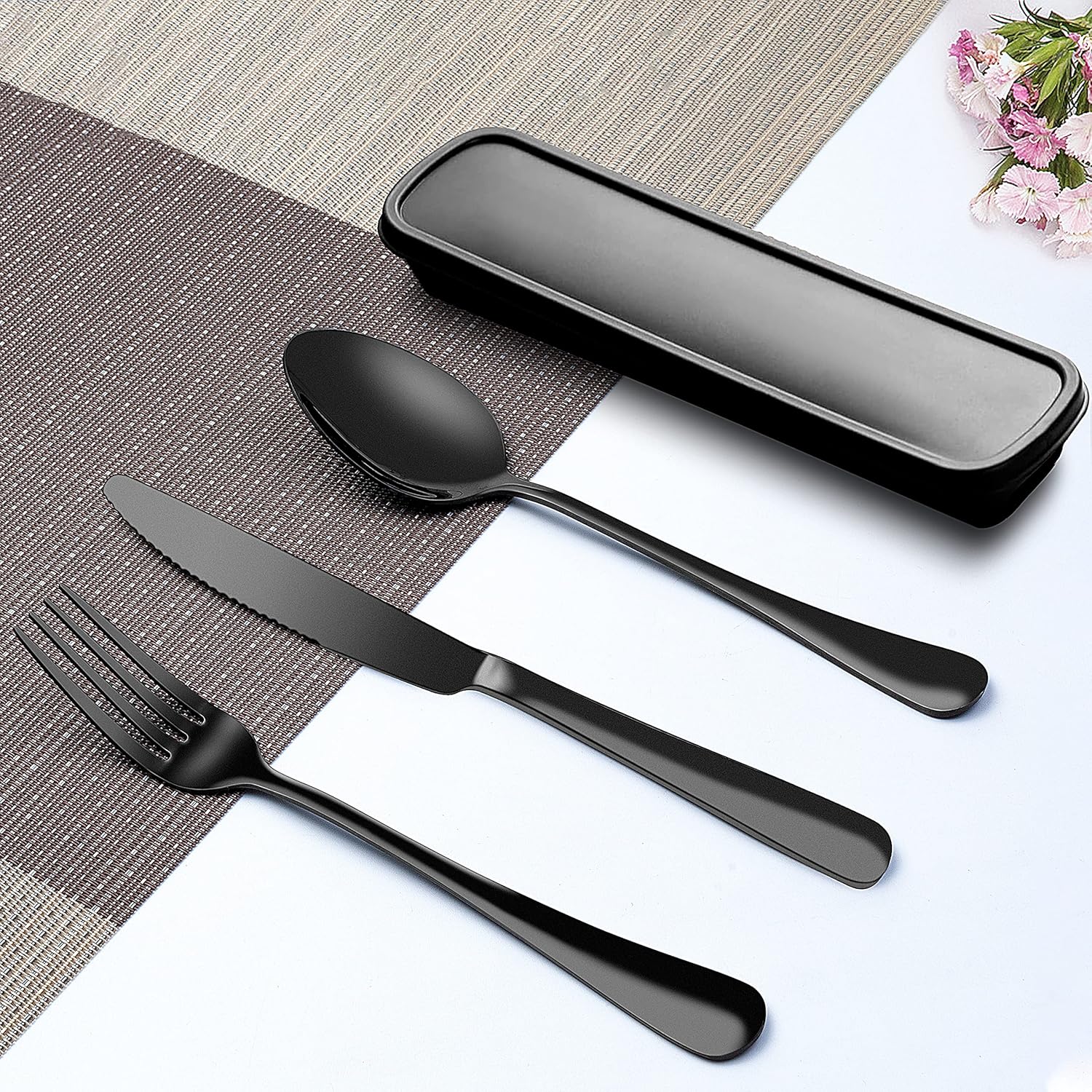 - Portable Cutlery Set with Case: 3 pieces reusable cutlery set with case, consist of 1 Dinner Forks+1 Dinner Spoons+ 1 Knives+1 portable carrying case